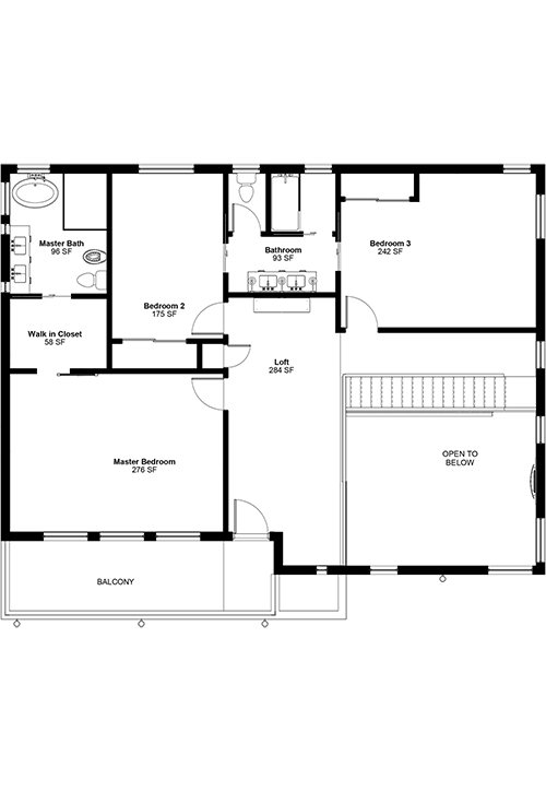 The Tuscan Villa has a second floor with a master bedroom suite that has a walk in closet and ensuite. Two other bedrooms on the second floor that share a Jack and Jill bathroom between the two bedrooms. The second floor loft overlooks the living room.